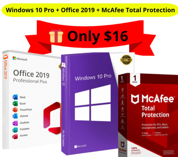 Windows 10 +Office 2019 + McAfee All-in-One Software Bundle